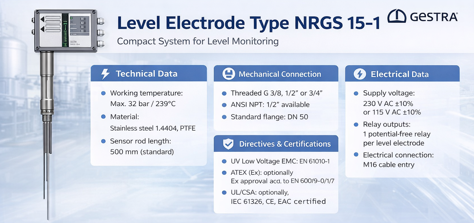 NRGS 15-1 thường được kết hợp với bộ điều khiển mức để cảnh báo hoặc ngắt hệ thống khi mức nước quá thấp hoặc quá cao, từ đó hạn chế các sự cố nghiêm trọng như cháy nồi hơi.